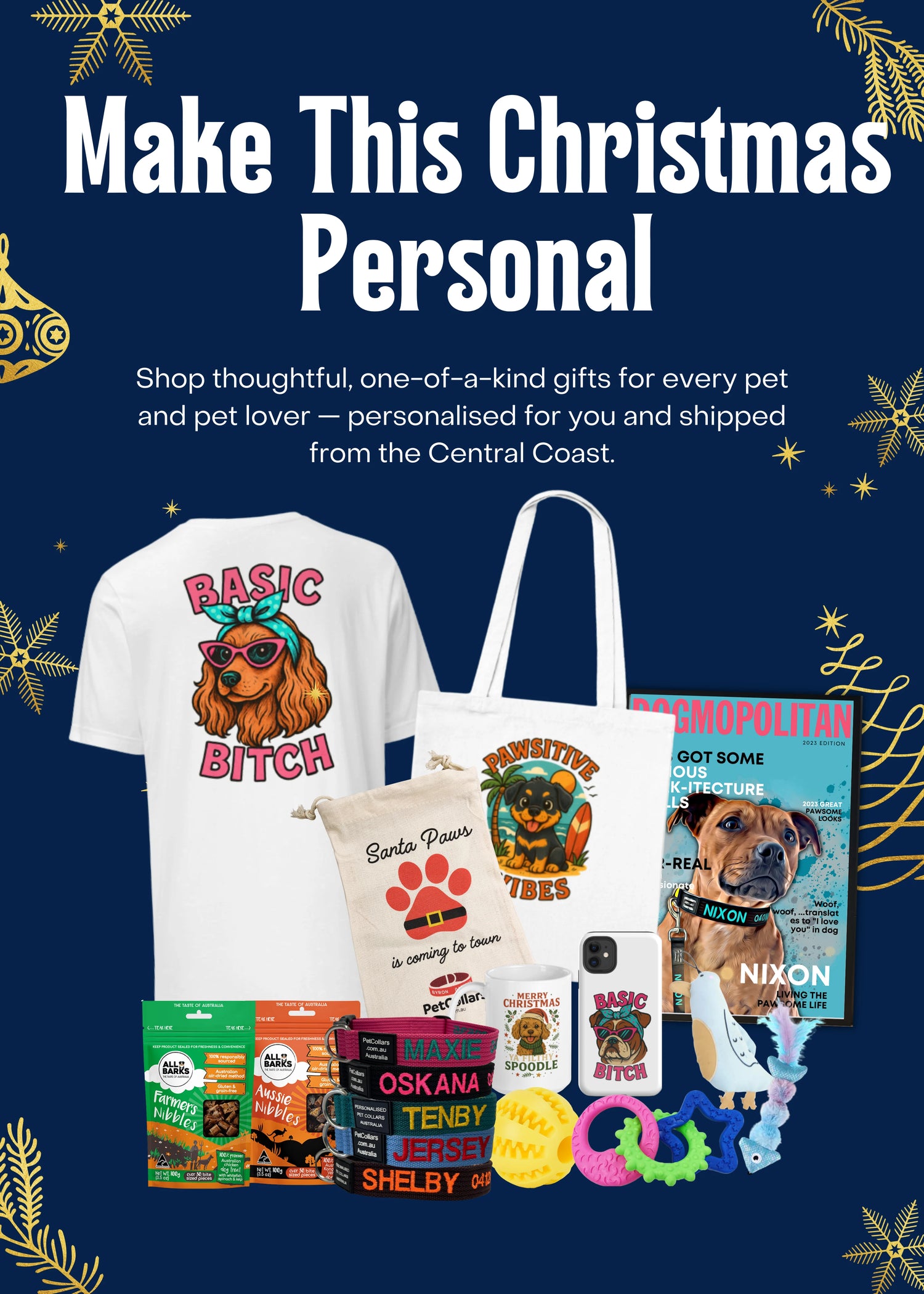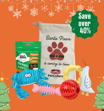 Perfectly wrapped, beautifully packed and ready to place under the tree. Each set includes Aussie treats, toys and accessories matched to your dog’s size — all chosen for quality and joy.