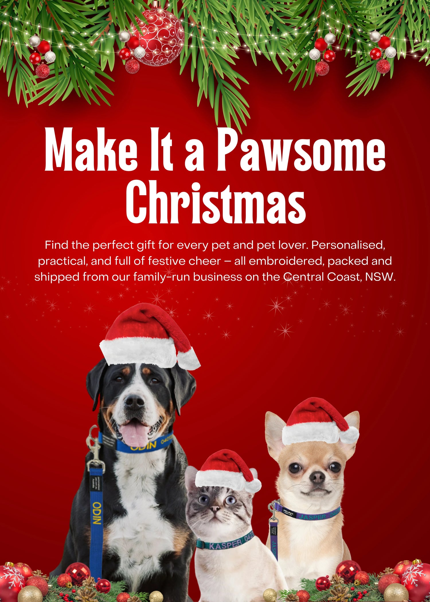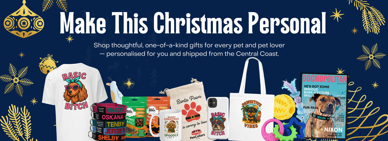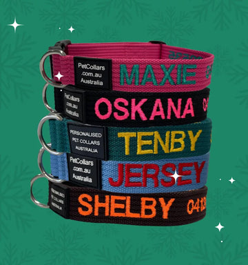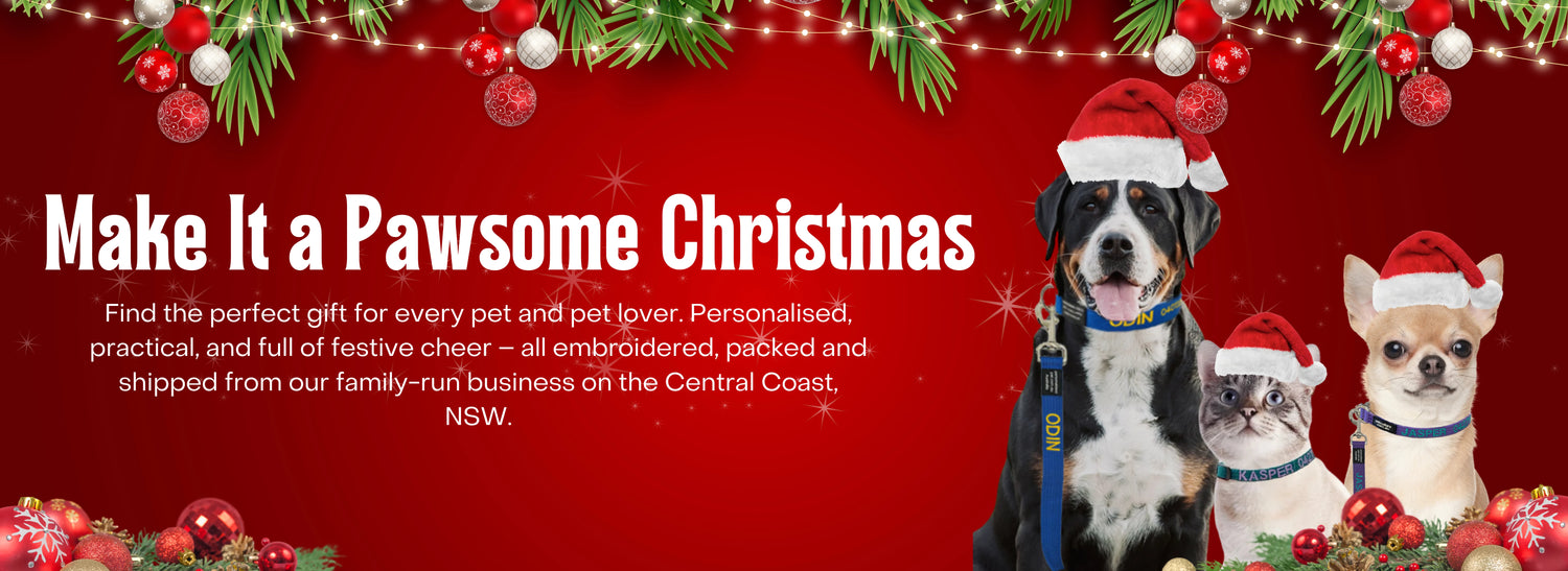 Our best-selling personalised collars and lead bundles are a Christmas classic. Embroidered with your pet’s name and your number, these durable collars can handle salt water, sand and mud — and still come out looking brand new.