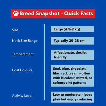 Most Ragdolls wear a Small collar. Use a soft tape to measure at the base of the neck and leave a two-finger gap for comfort.