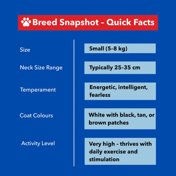 Most adult Jack Russells wear a Small collar, though some may fit an Extra Small or Medium, depending on their build. Use a soft tape to measure just above the shoulders and leave a two-finger gap for comfort.